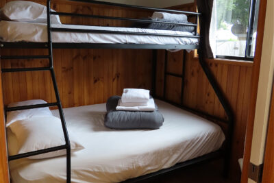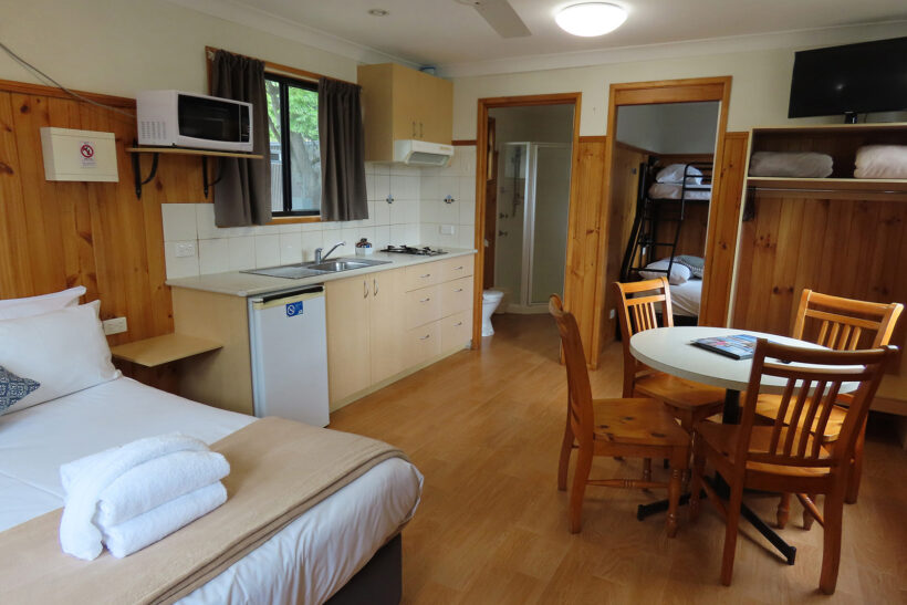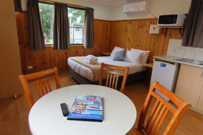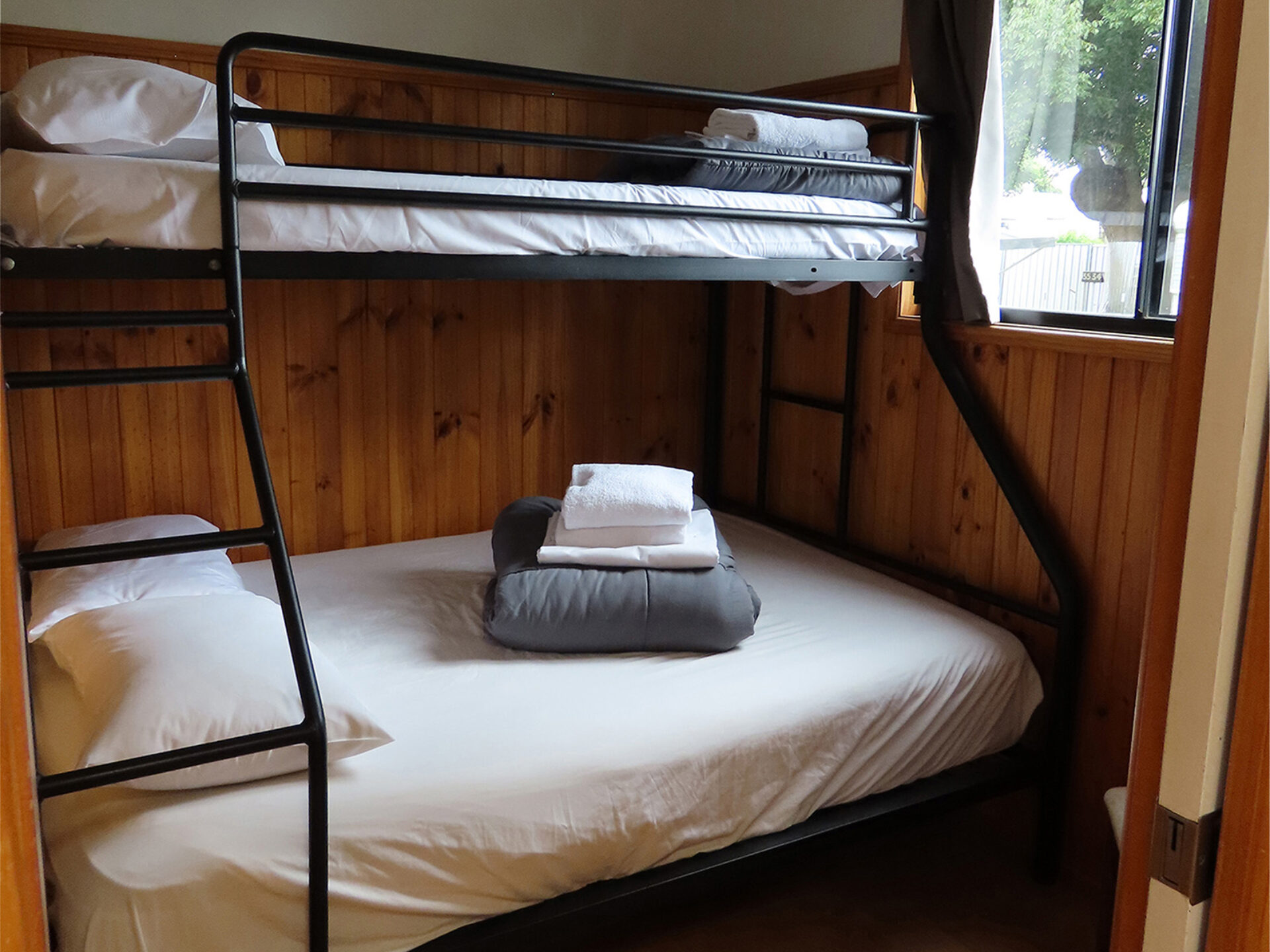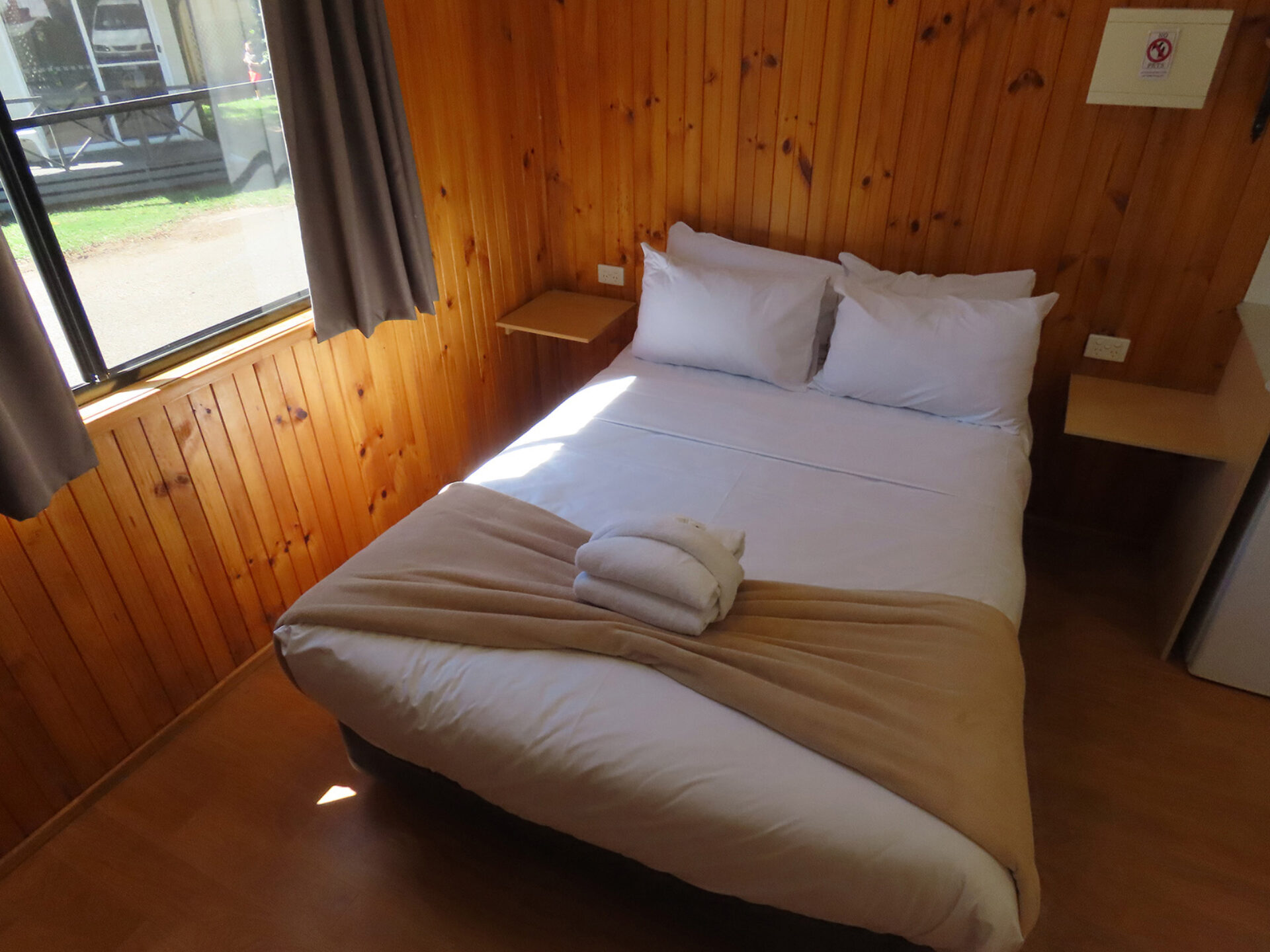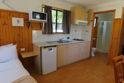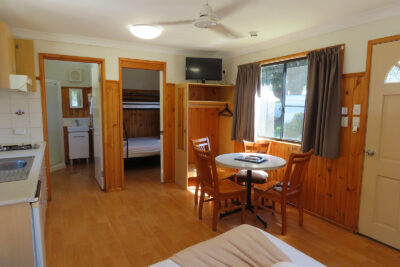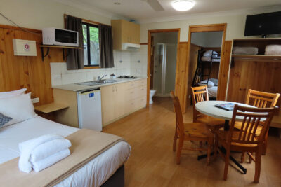 This modern 1 Bedroom Cabin offers a double in the main living area and double/single bunk in a separate bedroom with linen provided to all beds. It has a fully self contained kitchen with a dining table, digital TV, split system/reverse cycle air conditioning with car parking out the front of the cabin.