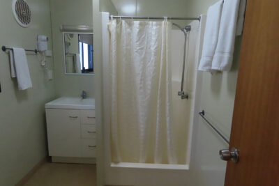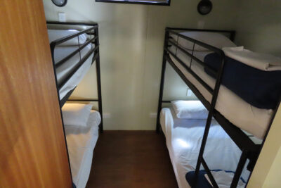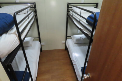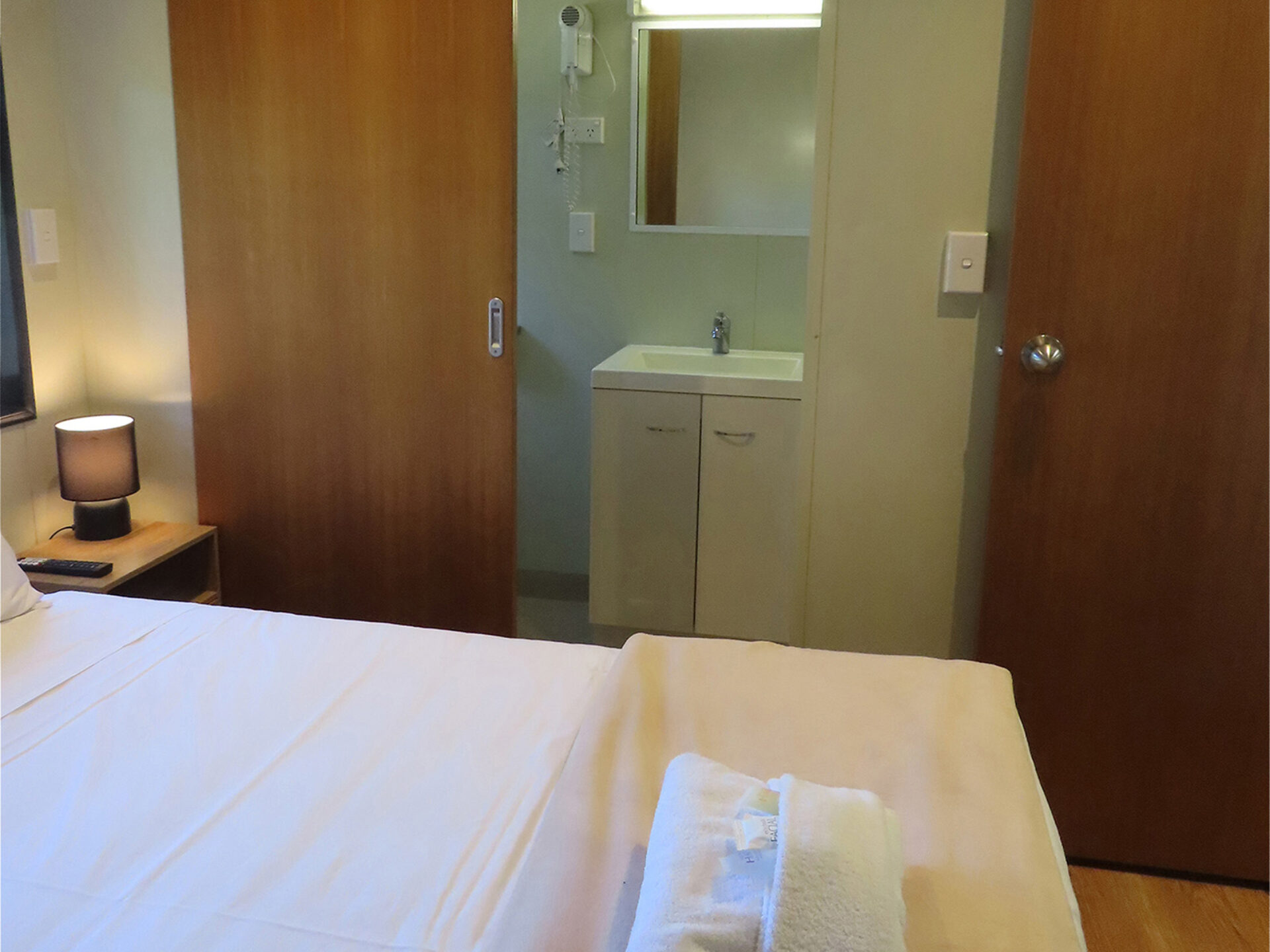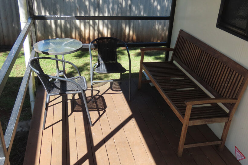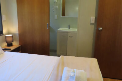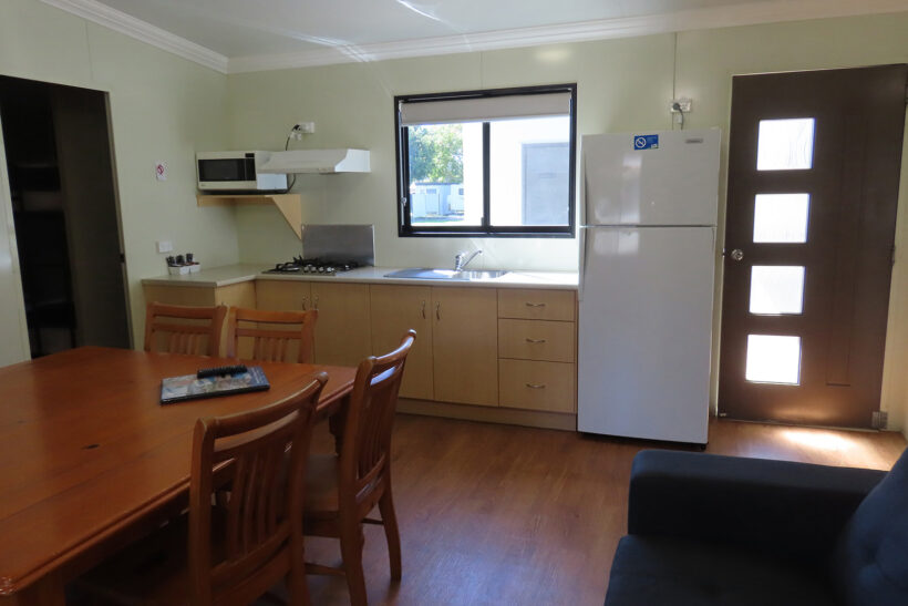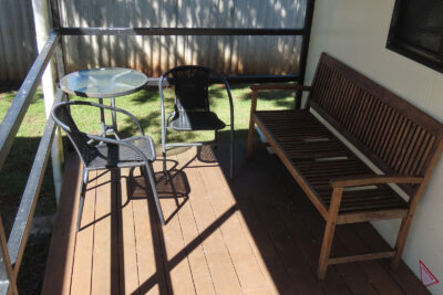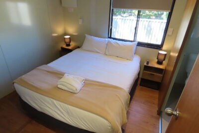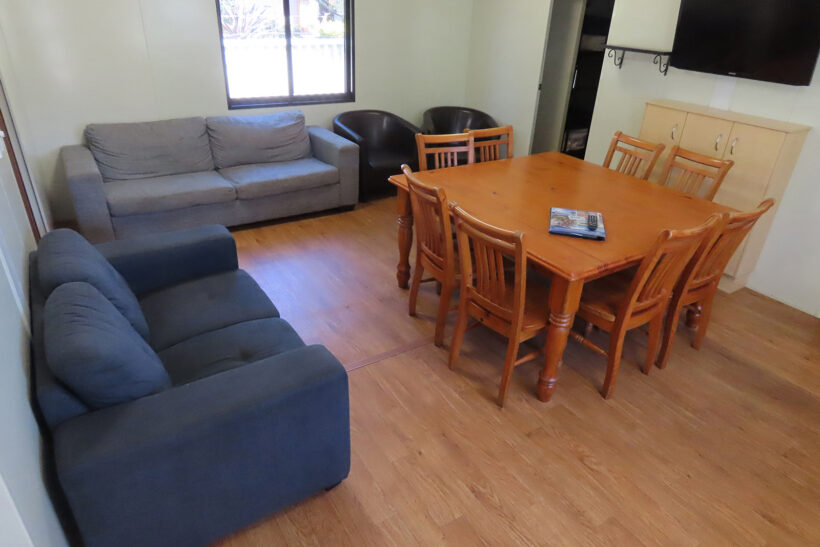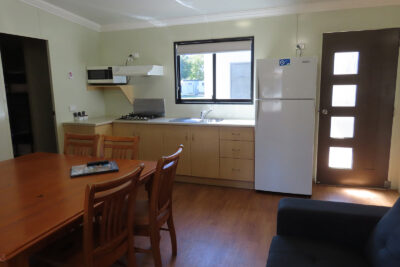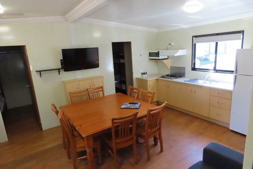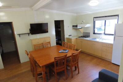The largest of our cabins can accommodate up to 10 people and is perfect for a large family or groups. | The cabin features a queen bed in the main bedroom that may be split into 2 singles. The other two bedrooms have 2 sets of bunks in each room. For convenience, this cabin has 2 bathrooms. | Cabin is fully self-contained with a gas hotplate, microwave, crockery, cutlery and utensils for 10 people. Living area also has a dining table, a spacious lounge and a TV. | There is an outdoor setting perfect to enjoy breakfast out in the open, and a BBQ nearby.