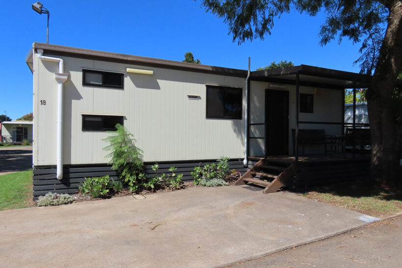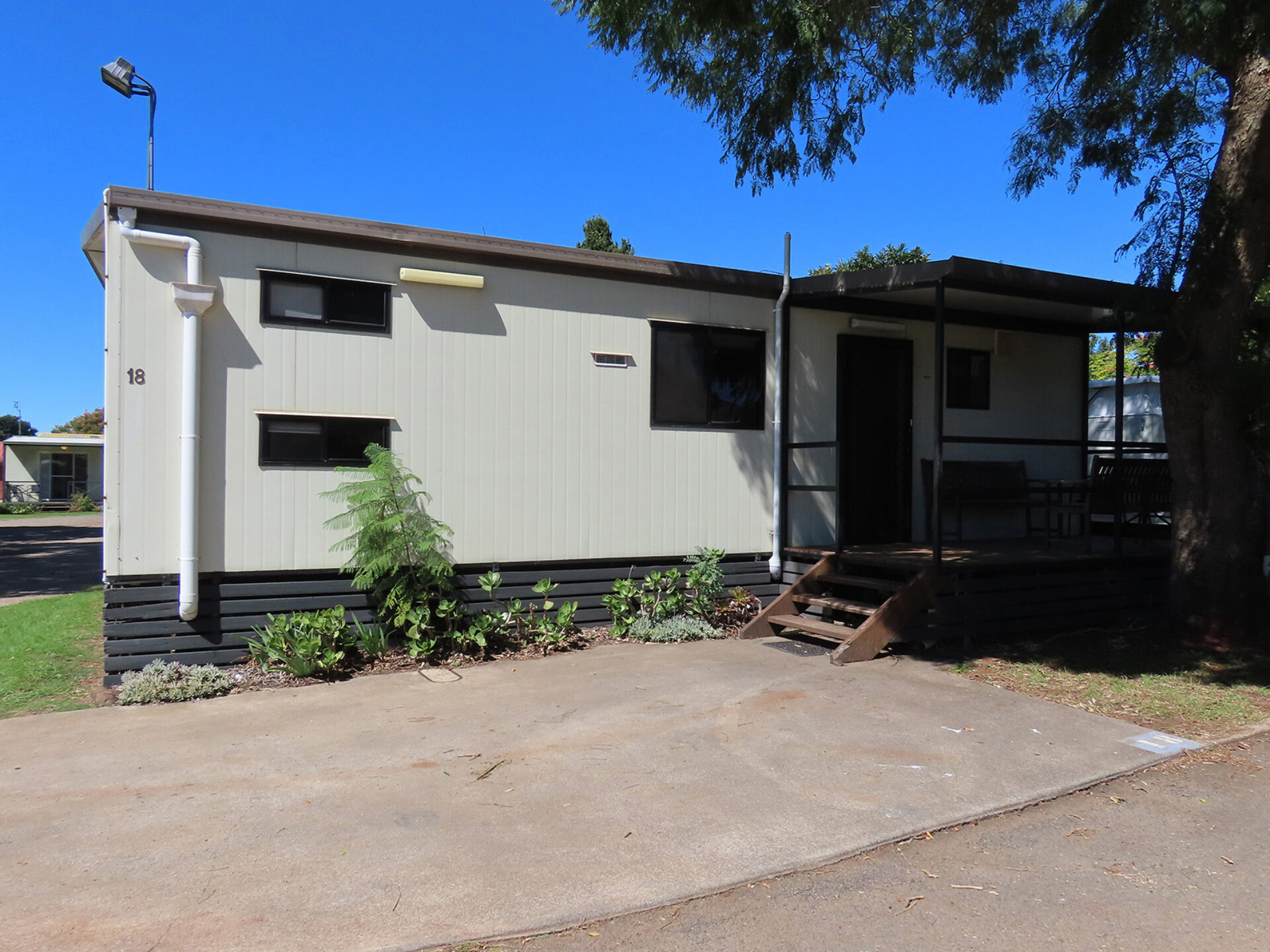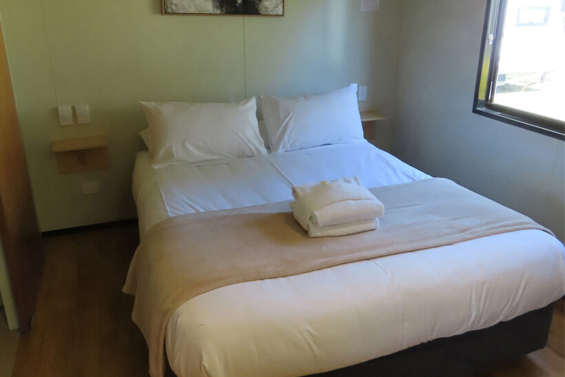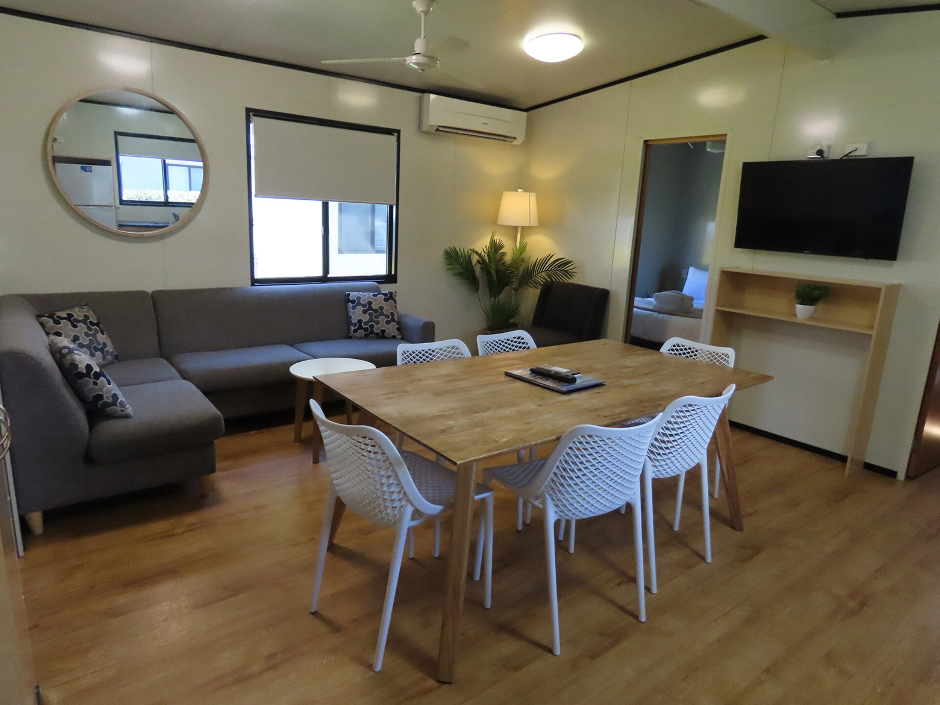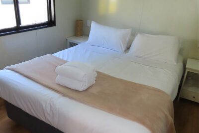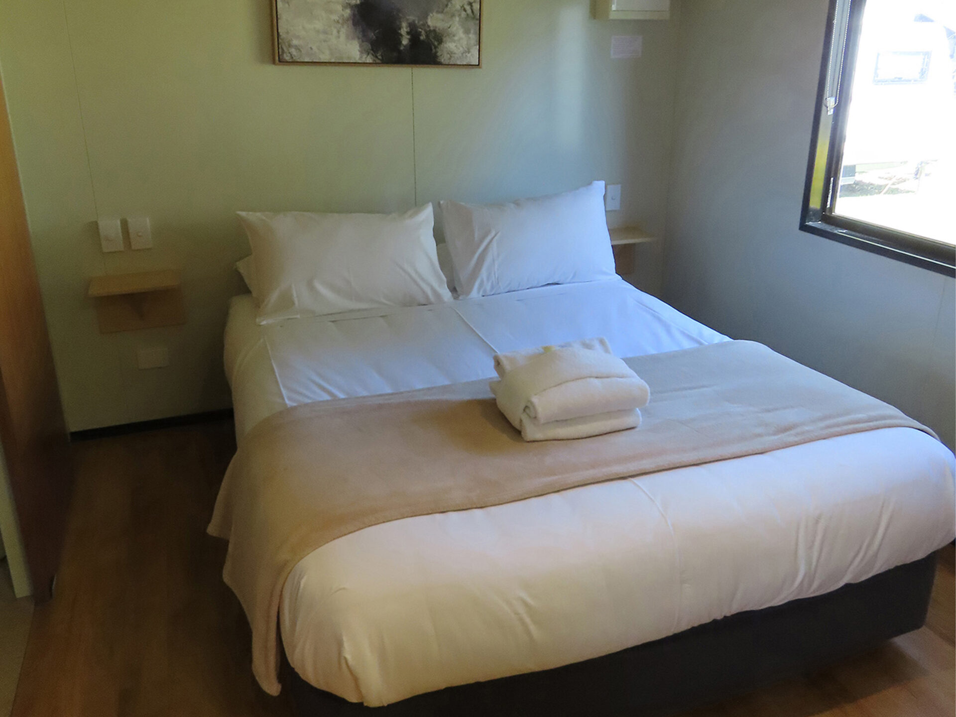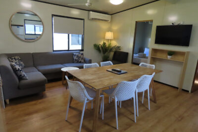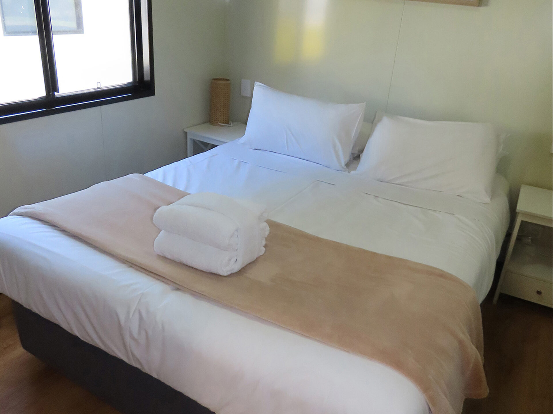 Newly refurbished, this fully self-contained cabin has 3 bedrooms and sleeps up to 8 people. Both main and second bedrooms feature queen beds and the third bedroom has two sets of bunk beds. The main bedroom has an ensuite with a separate toilet. The spacious separate living room/dining room has a fully self-contained kitchen, digital television, split system/reverse cycle air conditioning, and a comfy lounge to sit back and relax. Close proximity to pool area and jumping pillow.
