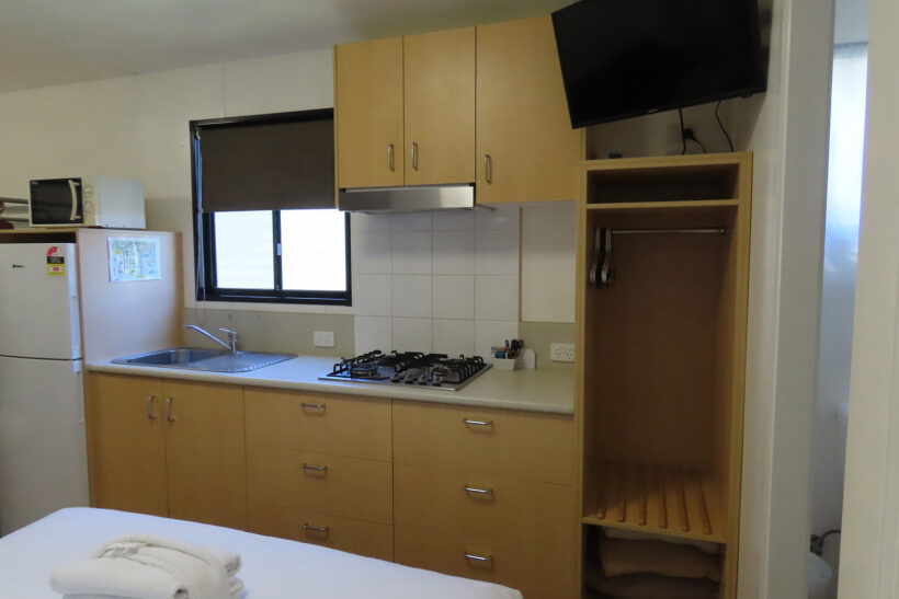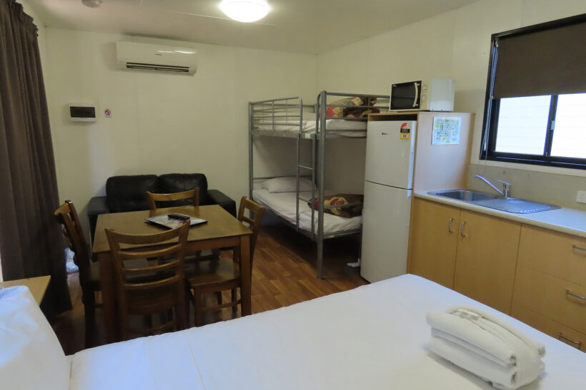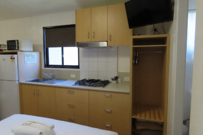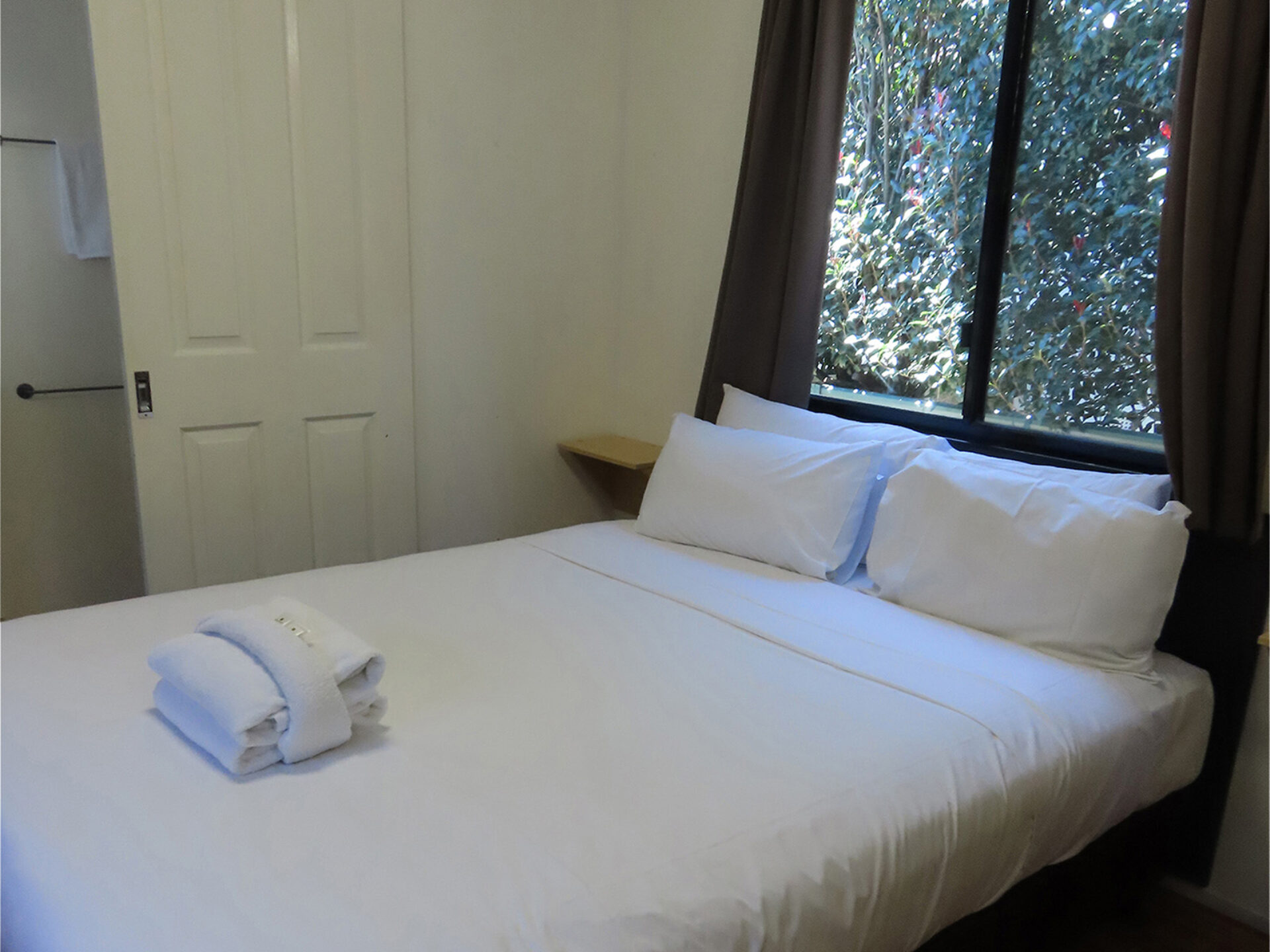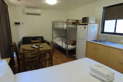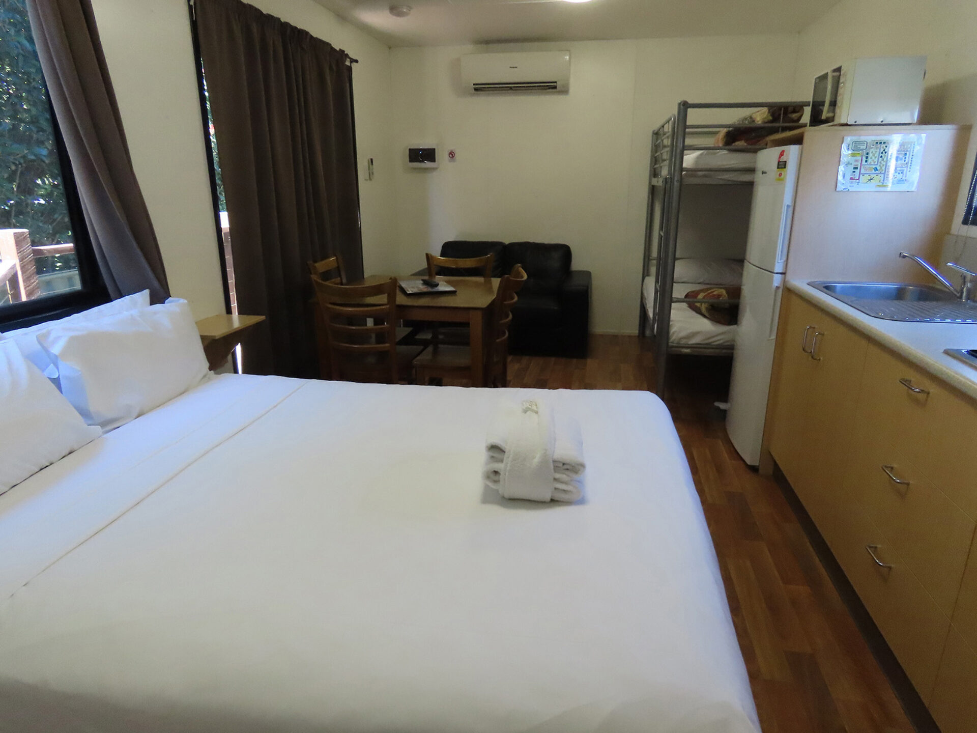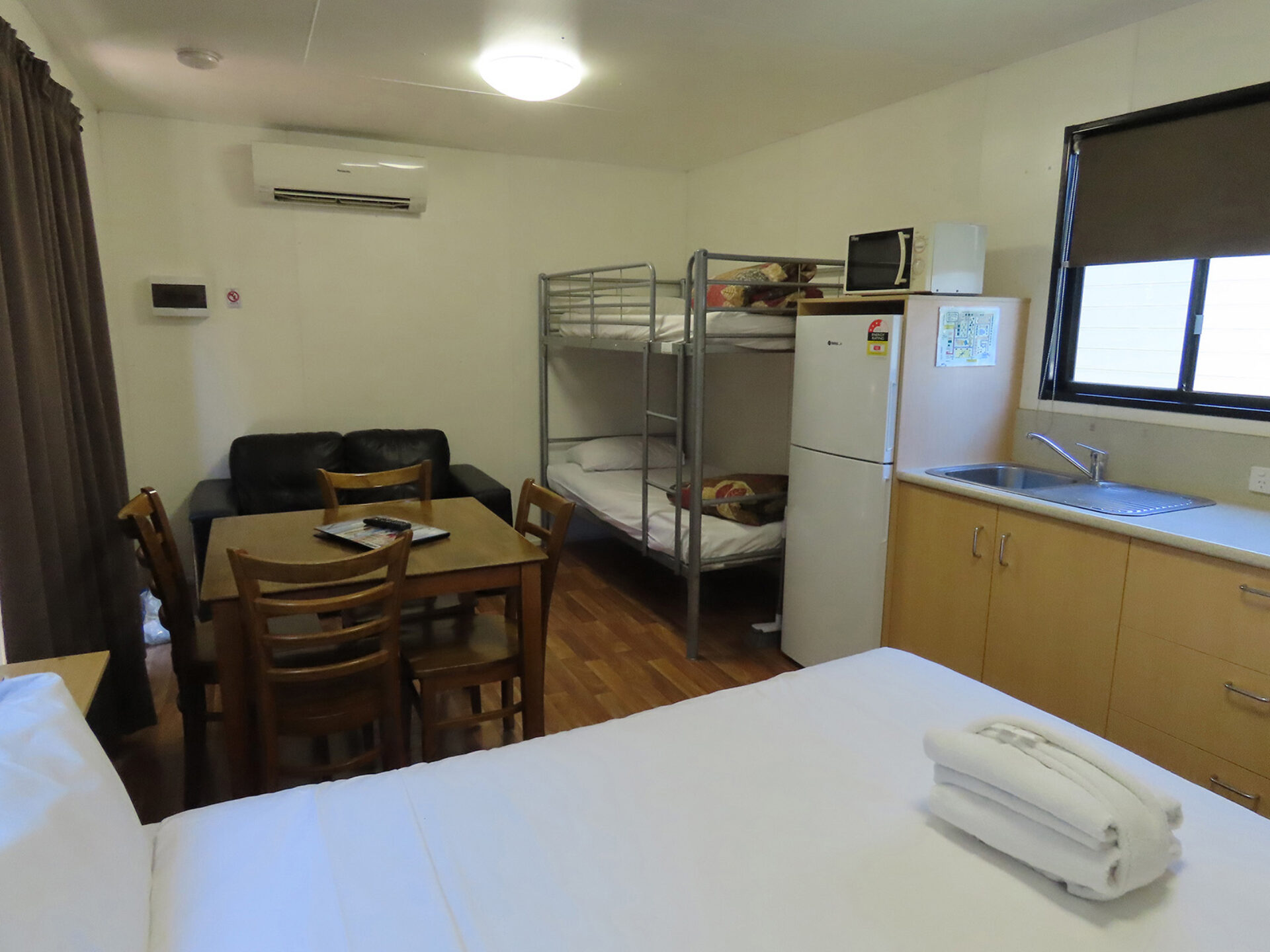 This fully self-contained modern open plan style cabin is simple but has all the necessities. Featuring a queen bed, set of bunks, ensuite, cooking facilities and split system/reverse cycle air conditioning for you to enjoy. Our cottage 4 berth cabins are close to all of the park facilities, BBQs, laundry and pool.